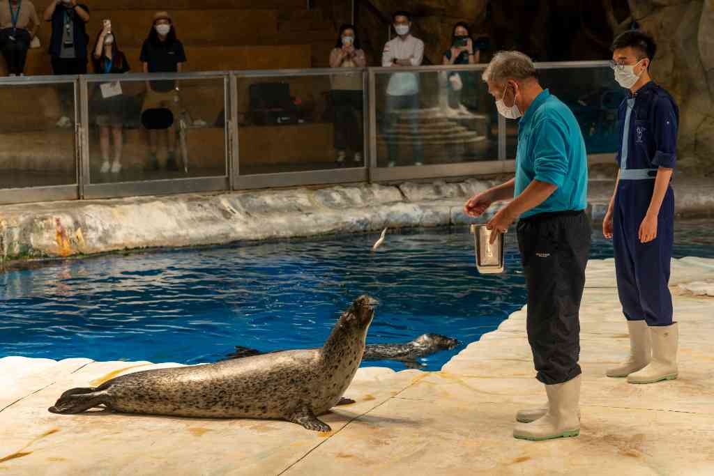 KK認為令他最印象深刻的是與動物相處的時間,「因為可以零距離與海豹接觸,而牠們也會漸漸和我們成為好朋友。」為動物準備食物,是後台護理人員其中一項主要的工作,別以為只要把動物的糧食拋進池中就行,「拋飼料要拋得有技巧,不能一下子掉到魚池裡,而在他們用膳之後,還要進行消毒的工作。」