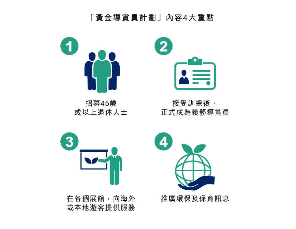 為了推動長者參與義務工作,退而不休,海洋公園自2016年起推出「黃金導賞員計劃」,截至2020年,已招募超過80位退休人士,有關計劃更參與了「賽馬會齡活城巿『全城.長者友善』計劃2020」。