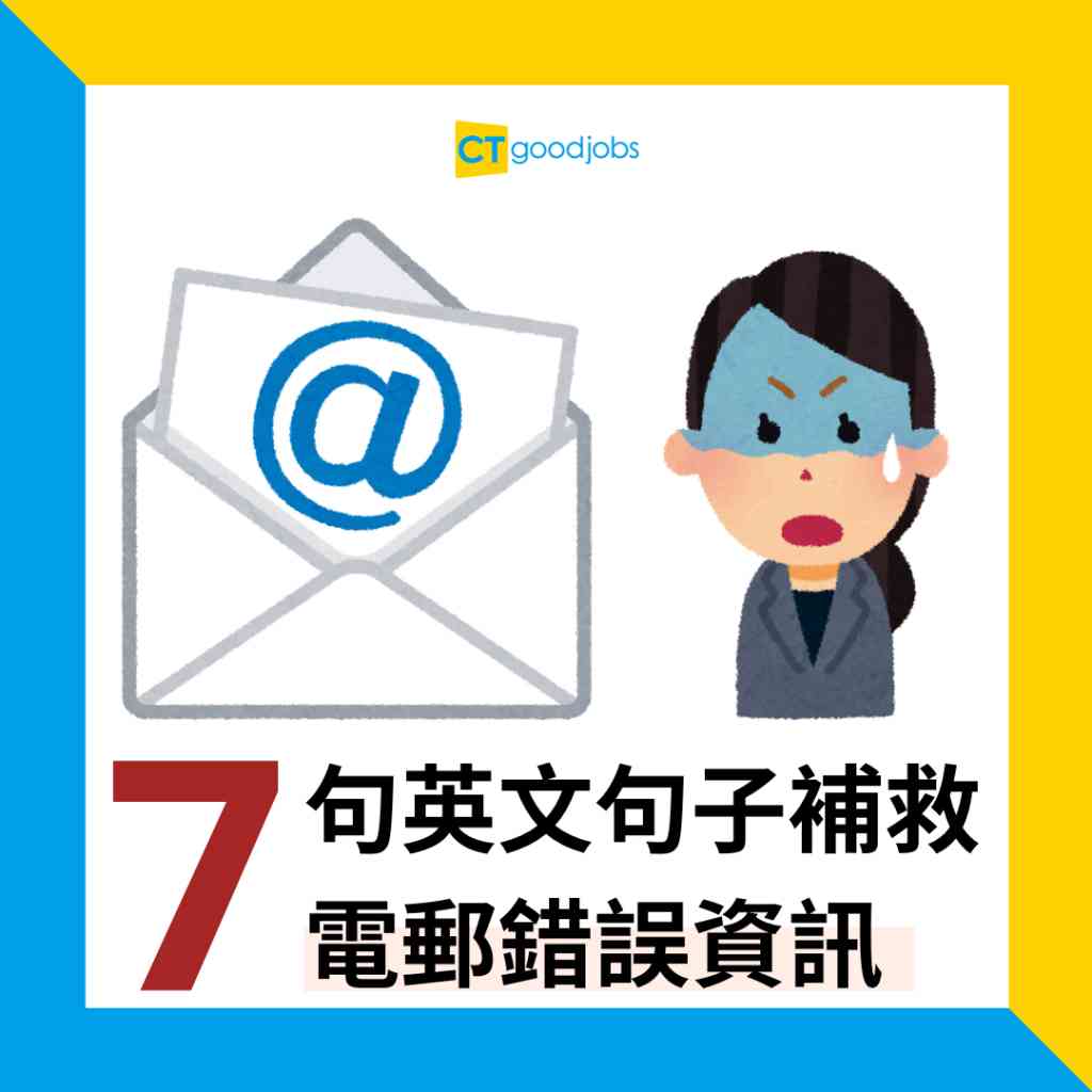 做文職的打工仔每日都要收發多封電郵(email),難免忙中有錯,例如「手快快」發送後才發現資訊有誤,或是傳送email後發現自己串錯字,忘記在電郵中加入附件等。出錯後應該如何「補鑊」?其實發現錯誤後,可以透過再補發一次電郵更正內容上的錯誤。CTgoodjobs今次教你7句實用電郵句子,讓你即使發送了錯誤資訊的電郵,亦能輕鬆更正錯誤。