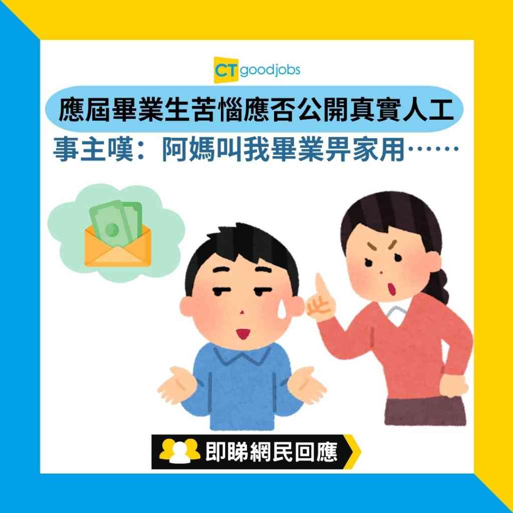 「話說我係今年Fresh Grad,搵到一份幾好Pay嘅IT工,阿媽話我畢業,要開始交家用,我就話人工唔夠自己生活,要用嚟還借返嚟嘅學費,還埋唔夠用。唔知各位會唔會如實分享人工數字?」