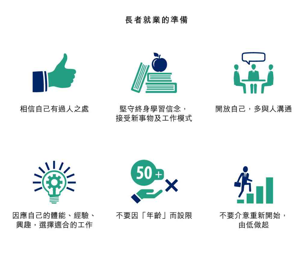 隨著人類的壽命越來越長,年過50仍然精力充沛,還有很多發展空間。坊間不少機構都積極協助較年長人士開展精彩的人生下半場,透過就業培訓、工作配對及創業支援等形式,支持他們繼續活躍於職場,甚至探索其他範疇的發展。這批優秀的人力資源更可幫助僱主和企業創造價值,為就業市場注入新力量。