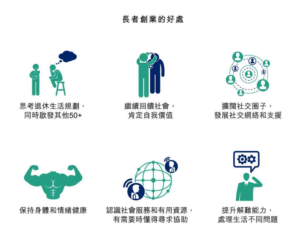 計劃業務經理許傲明(Mavis)表示,有很多退休人士擁有豐富管理經驗、高學歷,而且很樂意傳承人生經驗及知識,希望在退休後和社會保持聯繫。「這班來自不同界別的參加者了解社會議題和需要,找出有發展潛力的業務,並組成團隊迸發出不同點子,以產品或服務回饋社會。」計劃有超過2,000名人次受惠,不但推動社會對個別議題的關注,例如吞嚥困難患者、病患照顧者及「雙老戶」長者,亦製造長者就業機會。