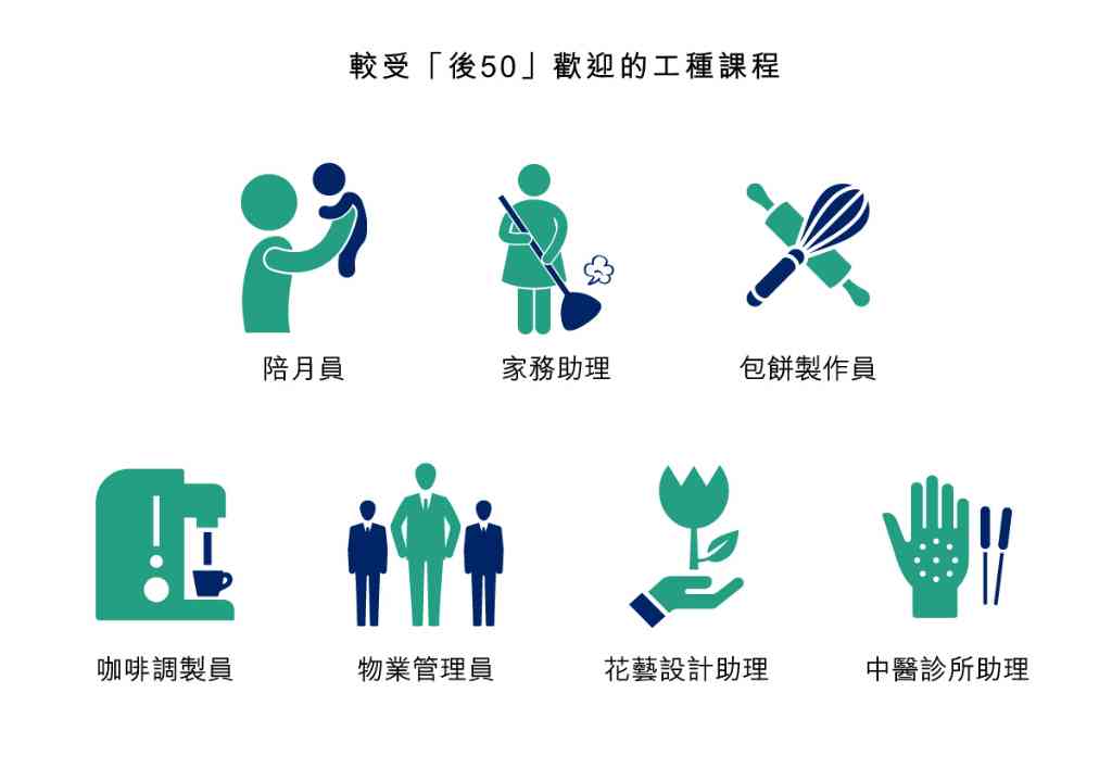 僱員再培訓局(ERB)主席余鵬春先生, GBS, JP指出,ERB在2019年特別建立了「後50」這個新稱號,用作稱呼50歲或以上人士。「後50」擁有豐富的人生經驗和閱歷,在職場上具有忠誠、可靠及穩重的質素,是不可多得的潛在勞動力。事實上,近年在ERB的學員中,有一半以上都是「後50」,顯示他們對再培訓的需求殷切,進修和就業的意欲顯著。因此ERB積極推出相關的培訓和支援項目,裝備「後50」重投就業市場,協助他們釋放潛能,長遠有助紓緩本港因人口持續高齡化和勞動力不足所帶來的壓力。