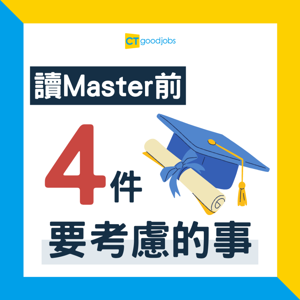 讀Master最大的掙扎一定是時間和金錢,碩士課程至少花費數十萬。你要知道付出的錢和得到的收穫未必成正比,以你的人工要多久才回本呢?如果半工讀的話,你又有心理準備一邊工作一邊讀書嗎?大家需要定下清晰目標,善用金錢和時間。