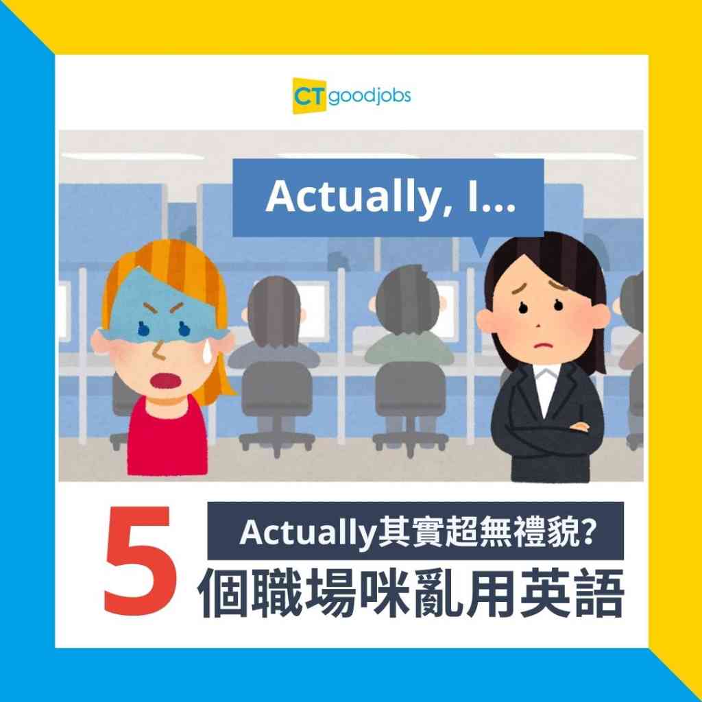 香港人從小接受英語教學,在說話時會不自覺中英夾雜,例如會說「Actually我覺得....」或是「無問題, I’ll try」,以為這些句子很生活化,不少外國劇集的演員都會這樣說,但在職場對上司同事或客戶使用,分分鐘得罪人而不自知,以下有五個職場上要小心使用的英文詞語,下次說前要想清楚,免得讓人留下不好的印象。