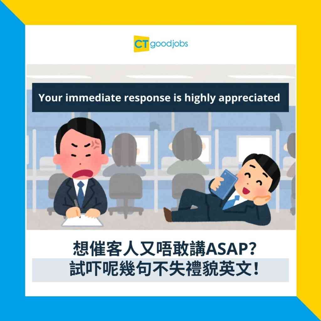 辦公室工作每天分秒必爭,天天都要面對「死線」,偏偏身邊總有患上「拖延症」的同事,三催四請都不能準時交貨。有打工仔近日就遇上這困擾,於是在連登討論區發文問道,除了「your swift response is highly appreciated」與「First , Second , Final reminder」,會否有其他更有禮貌的選擇?如果大家不想每次都在郵件寫上ASAP(as soon as possible),讓人感覺太咄咄逼人,不妨參考下面的例子,有效又不失禮,對付尊貴的客人亦適用。