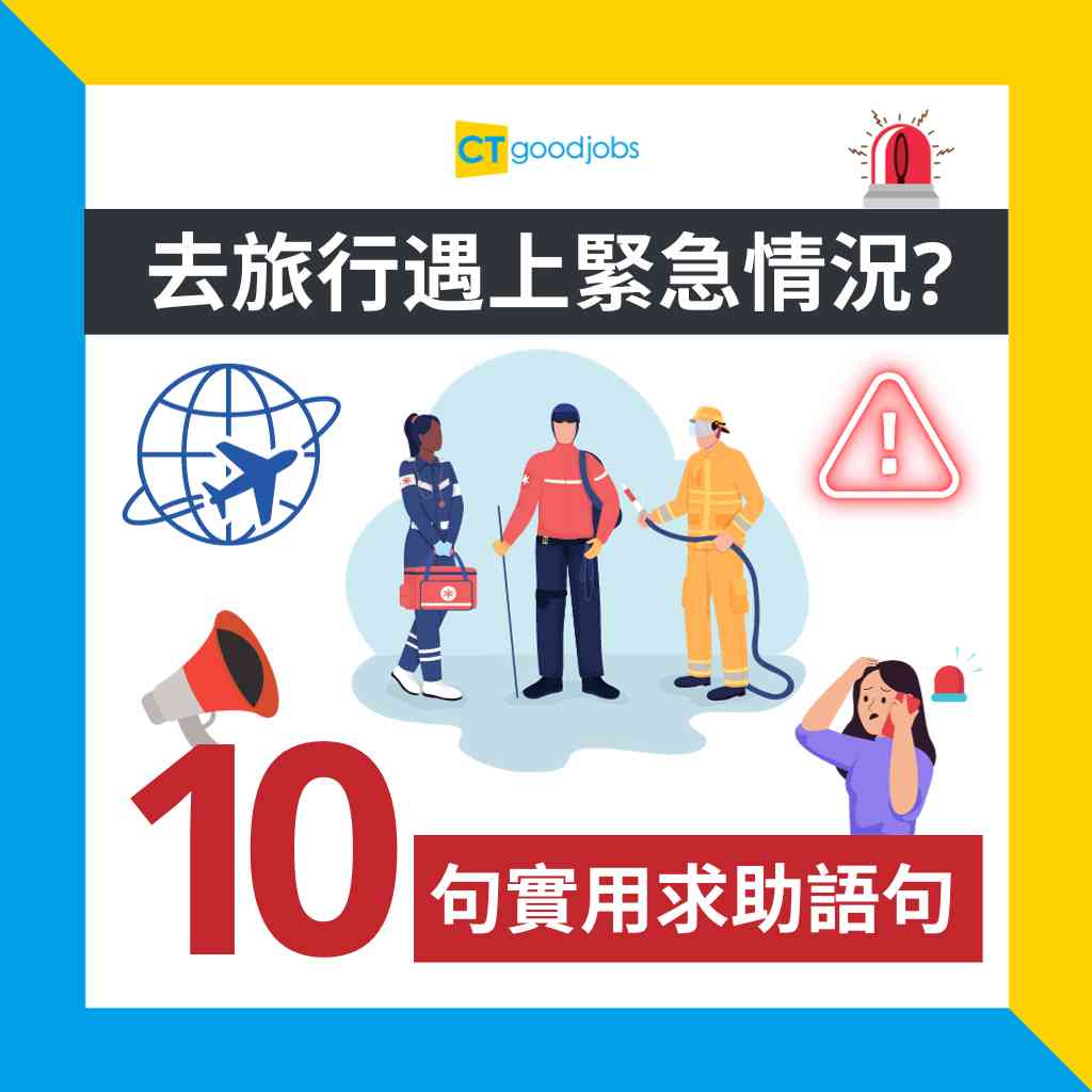 旅行是開心事,但萬一遇上意外或危險情況,大家又懂得如何應對嗎?當大家需要與當地執法人員、醫院、大使館等機構溝通,可以如何準確地表達所想,向相關部門求助?CTgoodjobs為大家盤點出10句實用求助語句,助大家解決困難。