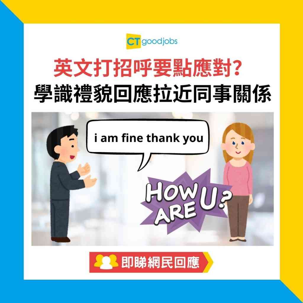 學習語言大多都會由問候語開始,而在英語世界不少人第一句學會的就是「how are you」。有打工仔不解為甚麼外國人那麼喜歡說這句話,而自己常常不知道如何回應。於是在連登討論區發起討論,指出平時多數會說「I am fine thank you and you」,但網民則建議其實還有很多英語字句,可以有禮地回應對方問候。